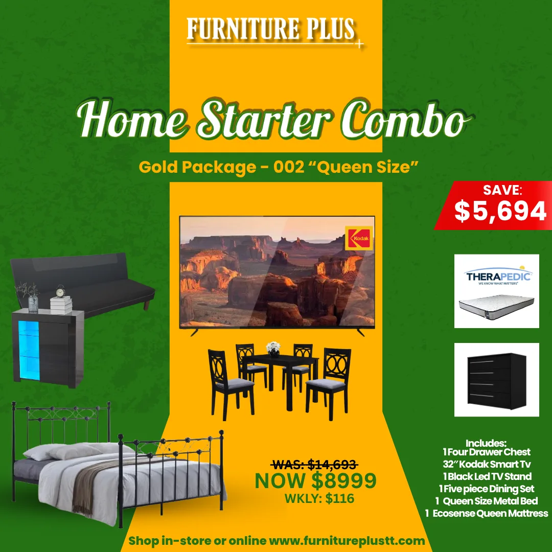 SaleFrom: TT$ 14,693 Original price was: TT$ 14,693.TT$ 8,999Current price is: TT$ 8,999.Weekly on HP TT$ 116Gold Combo Package 002 Queen SizeAdd to cart