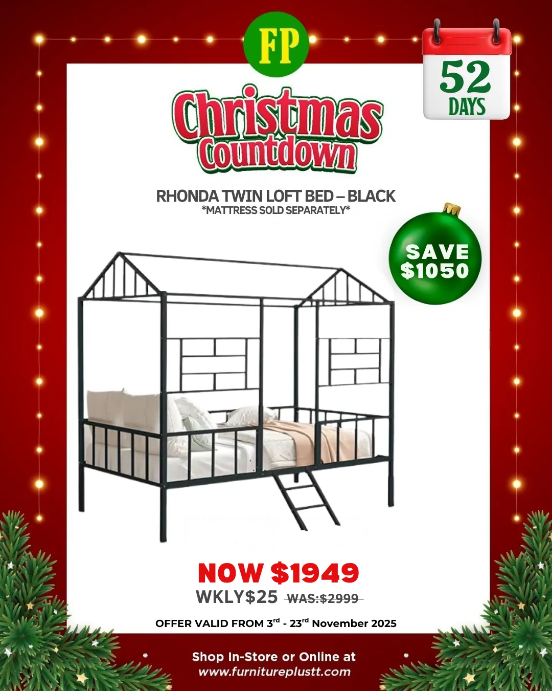 SaleFrom: TT$ 2,999 Original price was: TT$ 2,999.TT$ 1,949Current price is: TT$ 1,949.Weekly on HP TT$ 25Rhonda Twin Loft Bed – BlackAdd to cart
