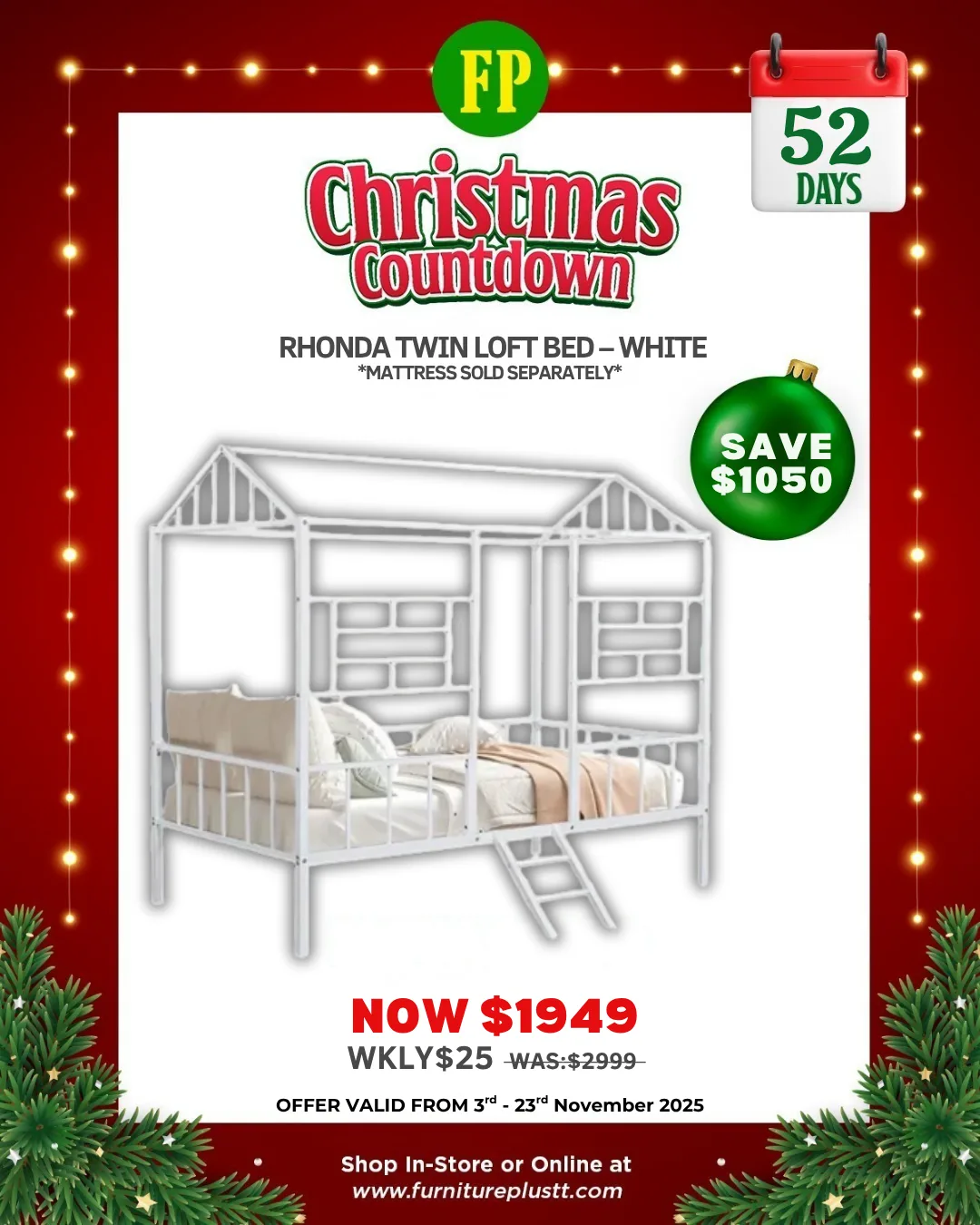 SaleFrom: TT$ 2,999 Original price was: TT$ 2,999.TT$ 1,949Current price is: TT$ 1,949.Weekly on HP TT$ 25Rhonda Twin Loft Bed – WhiteAdd to cart