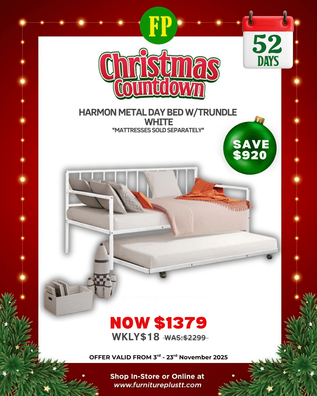 SaleFrom: TT$ 2,299 Original price was: TT$ 2,299.TT$ 1,379Current price is: TT$ 1,379.Weekly on HP TT$ 18Harmon Metal Day Bed w/Trundle WhiteAdd to cart