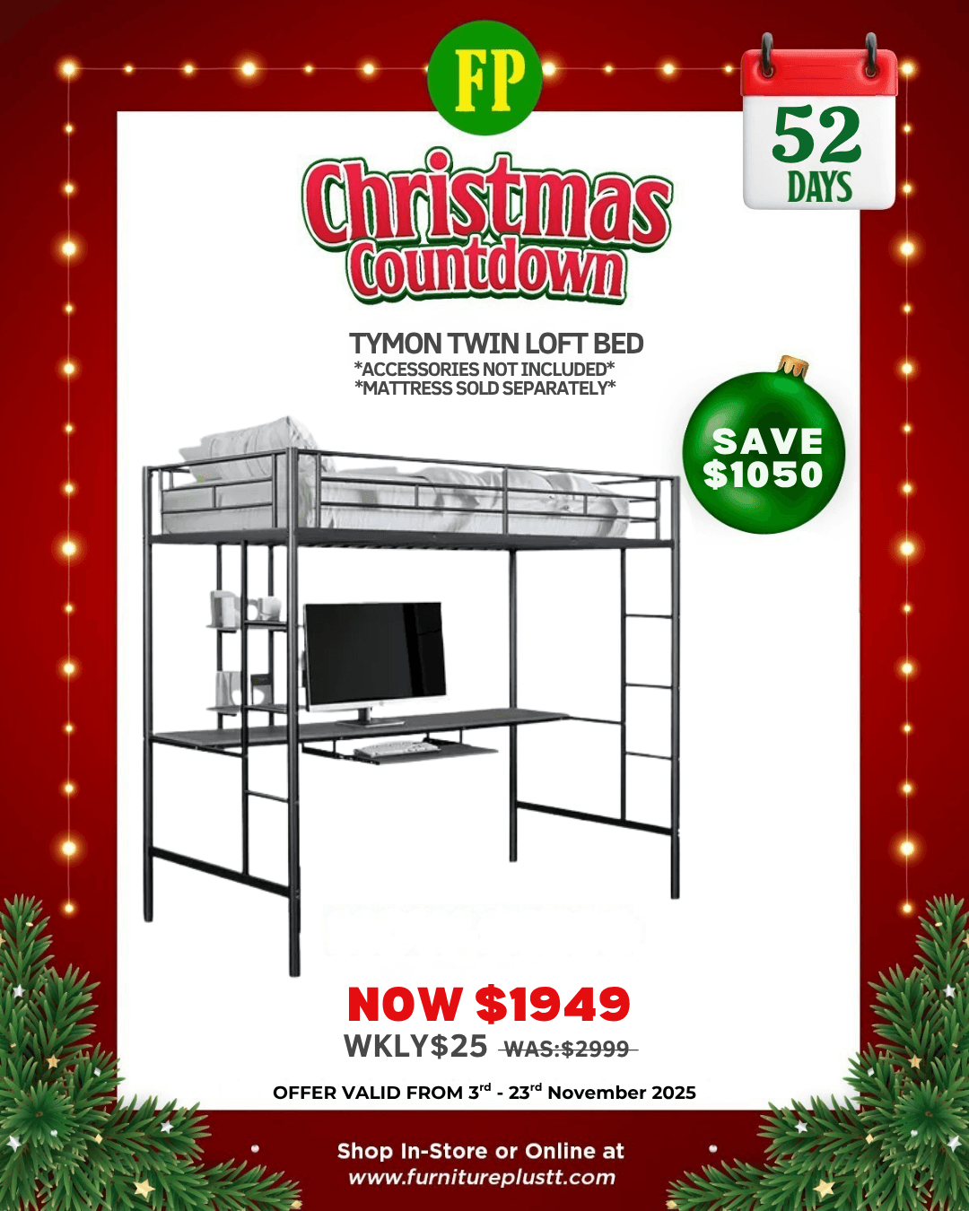 SaleFrom: TT$ 2,999 Original price was: TT$ 2,999.TT$ 1,949Current price is: TT$ 1,949.Weekly on HP TT$ 25Tymon Twin Loft BedAdd to cart